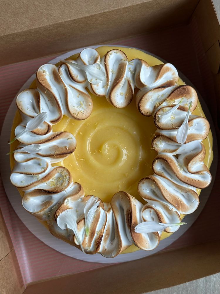 A lemon cheesecake with homemade lemon curd and swiss meringue on top. (6" cheesecake)